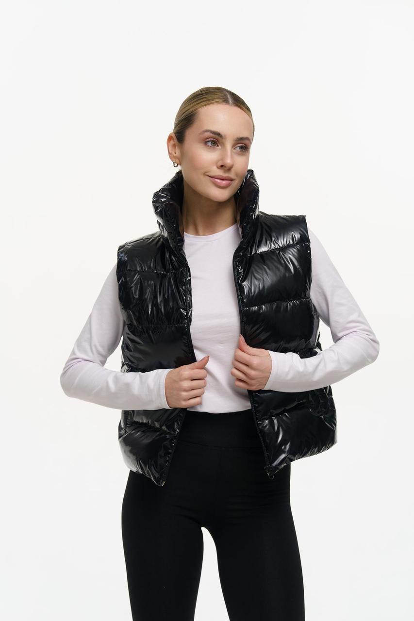 Жіноча жилетка чорна глянець коротка весняна осіння Безрукавка без капюшона демісезонна